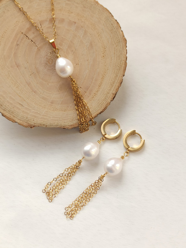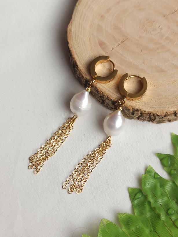 جفت گوشواره مروارید پرورشی درشت به شکل اشک، طول گوشواره حدود ۶ سانتی متر، دستساز، قفل و زنجیر و اتصالات استیل