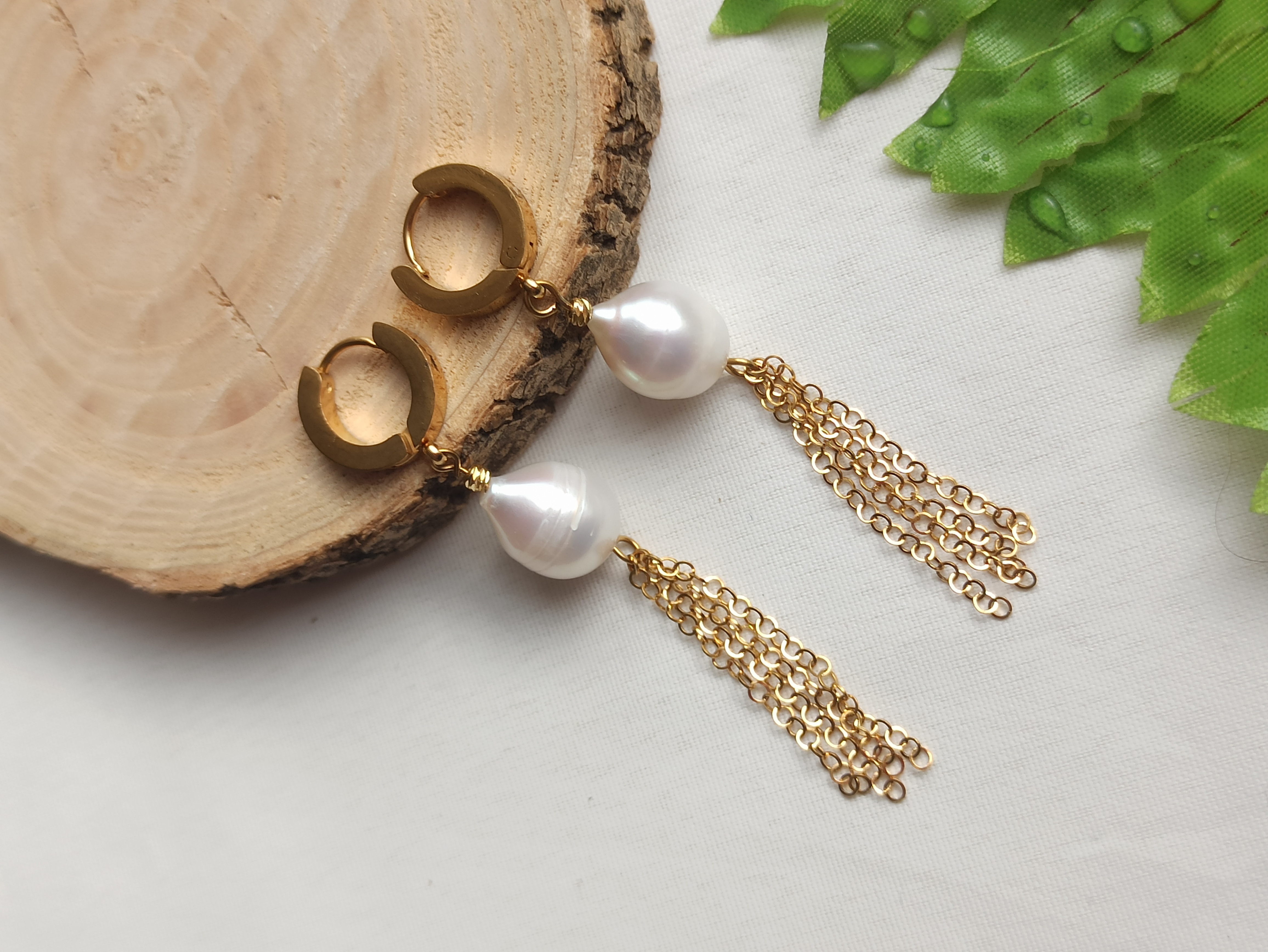 جفت گوشواره مروارید پرورشی درشت به شکل اشک، طول گوشواره حدود ۶ سانتی متر، دستساز، قفل و زنجیر و اتصالات استیل