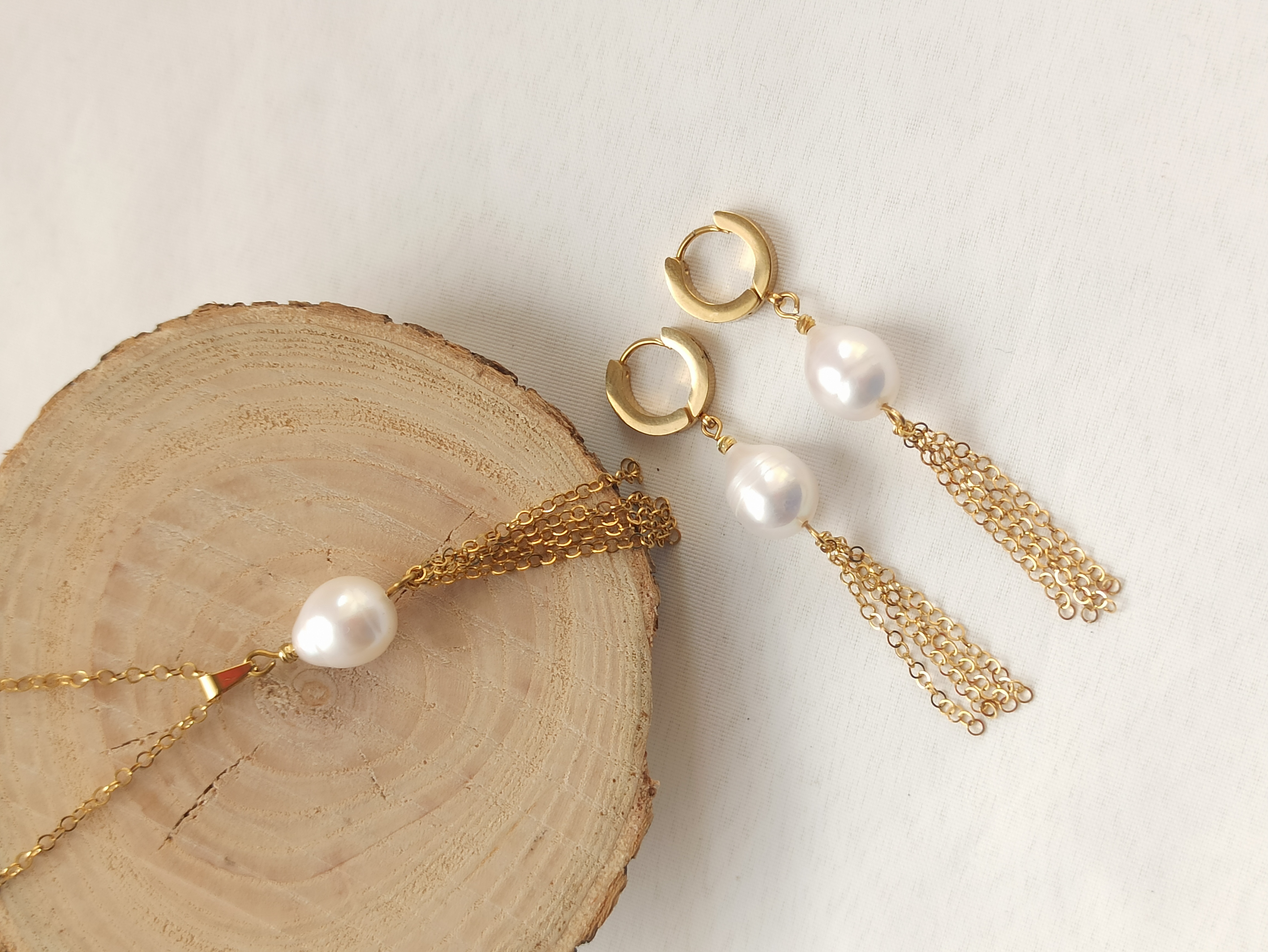 گوشواره آویز مروارید پرورشی اشکی زنجیری