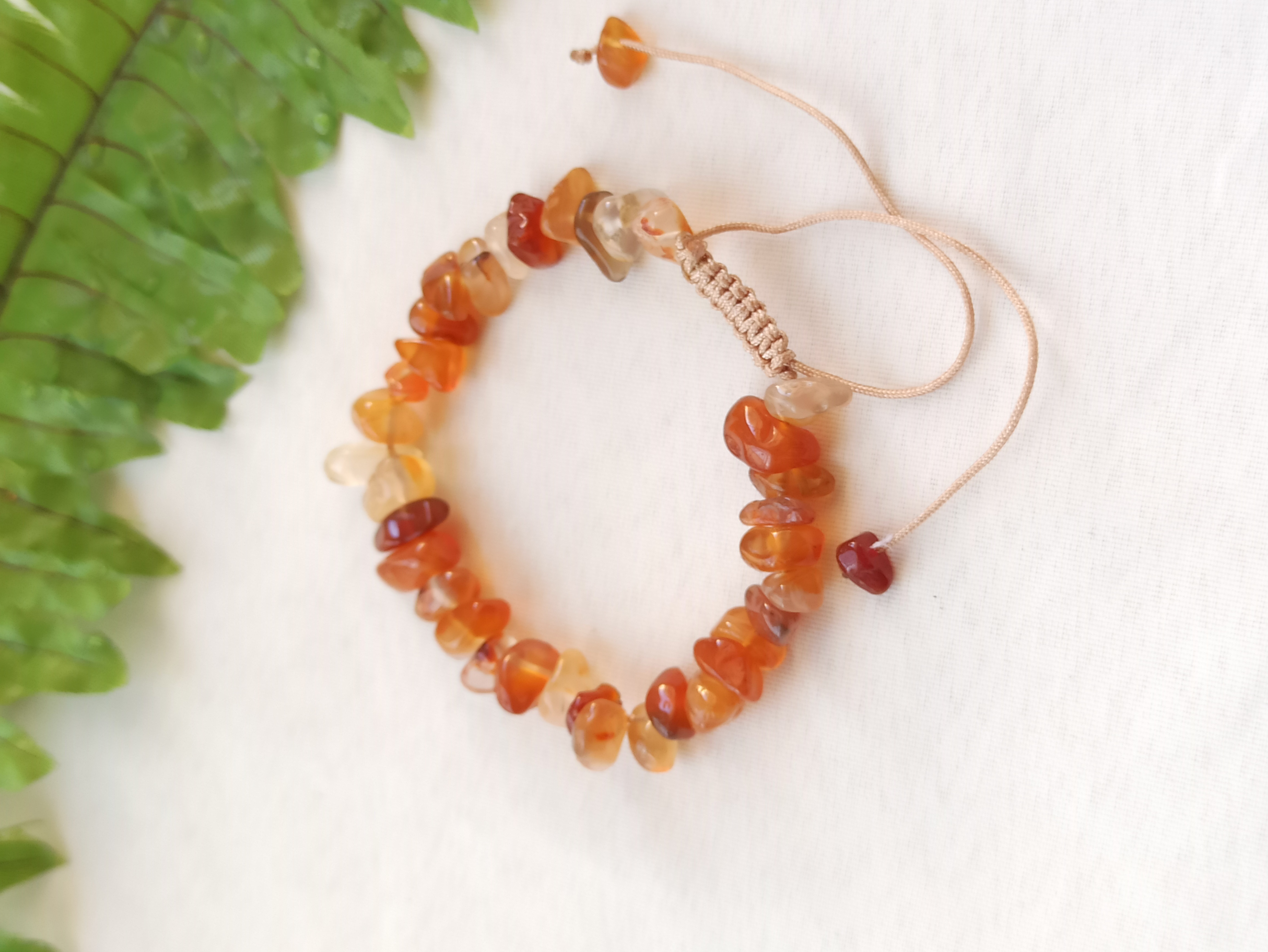 دستبند دستساز عقیق کارنلین چسپسی، گره کشویی، حداقل دور مچ ۱۷ سانت، همراه فاکتور معتبر