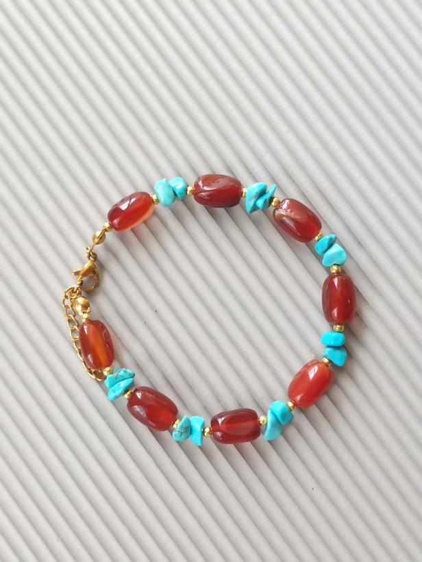 این دستبند بصورت دستساز با سنگهای عقیق و فیروزه ساخته شده، متریال و قفل آن استیل است، طول ۱۸ سانتی متر و زنجیر سایز دارد