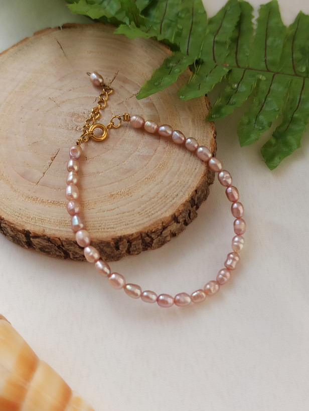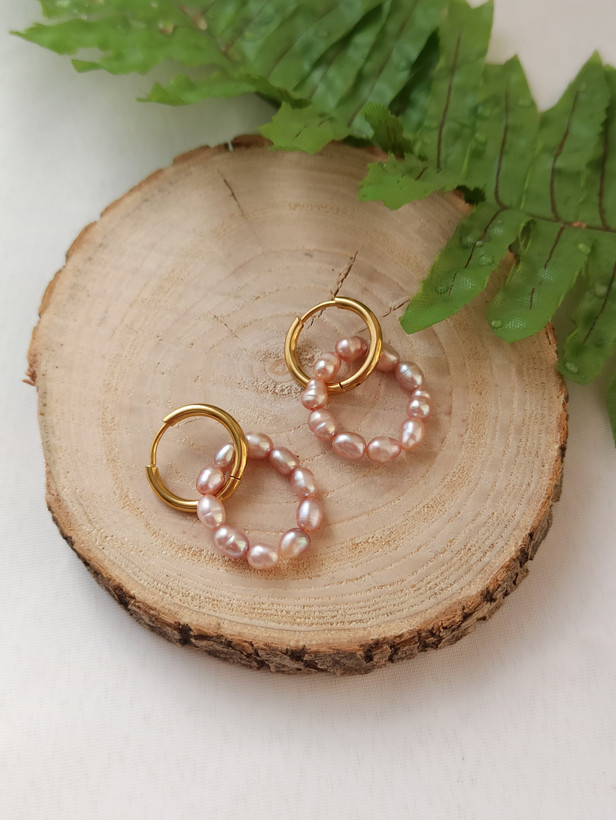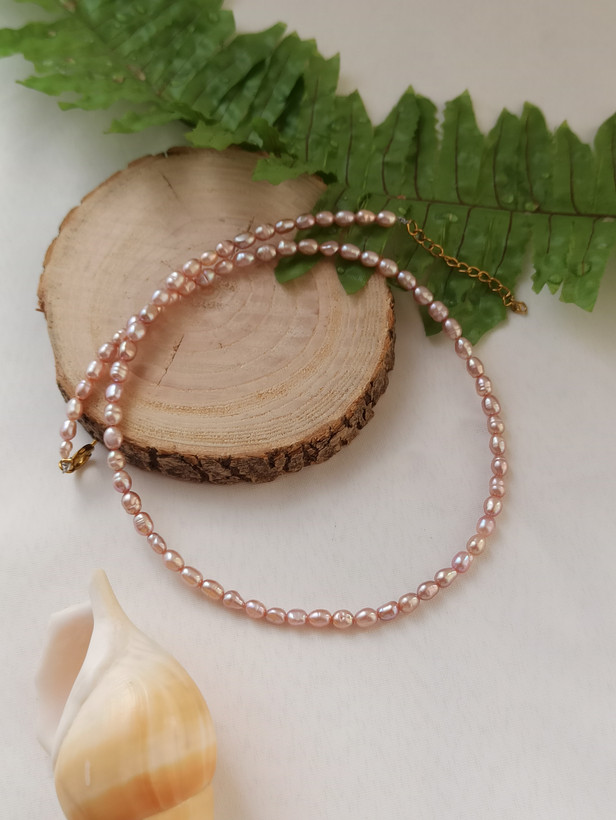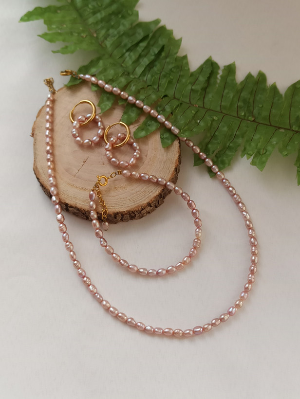 سرویس کامل مروارید پرورشی گندمی، صورتی ملیح، سایز ۴ میلیمتر، متریال استیل طلایی، دستساز