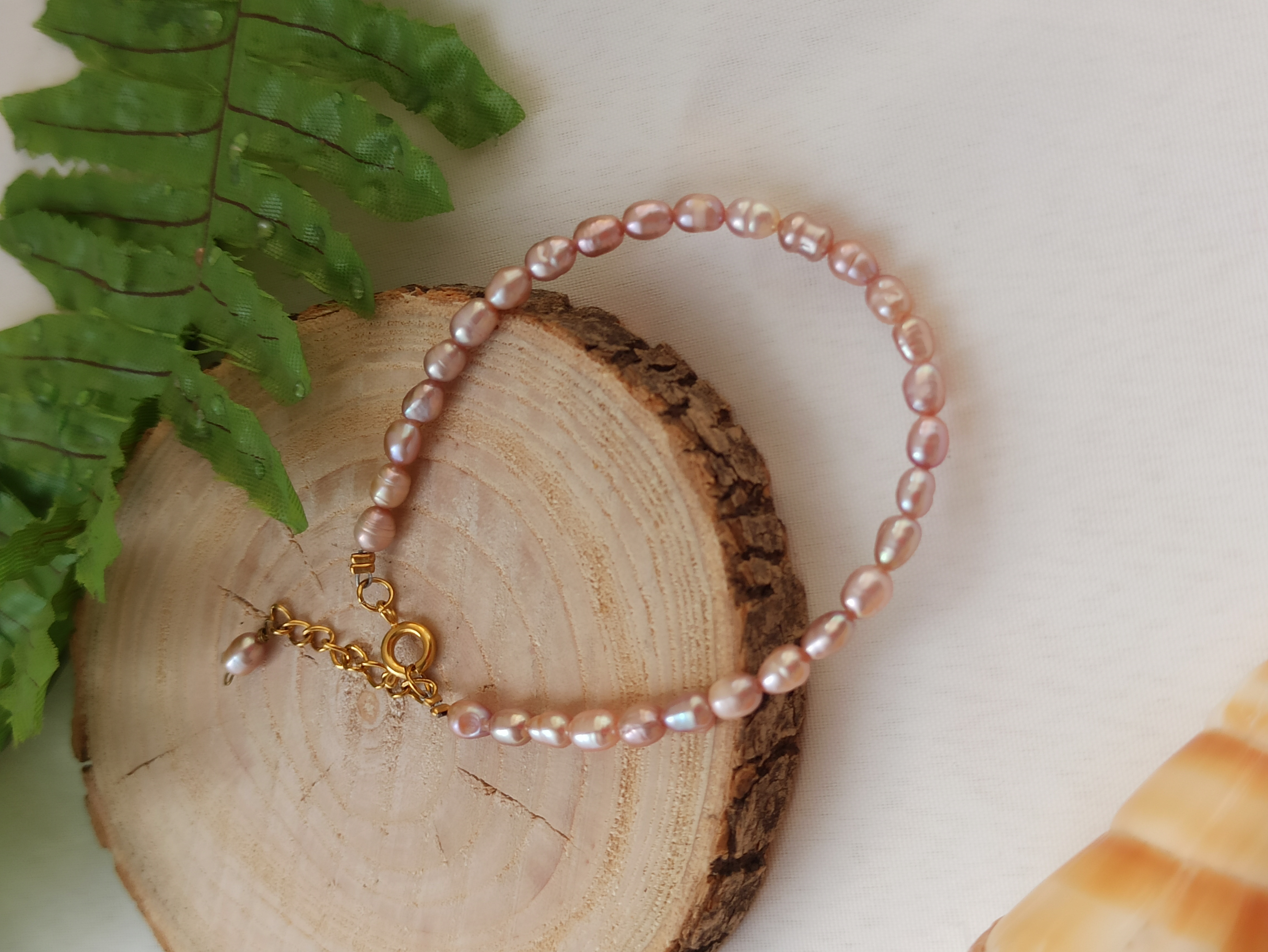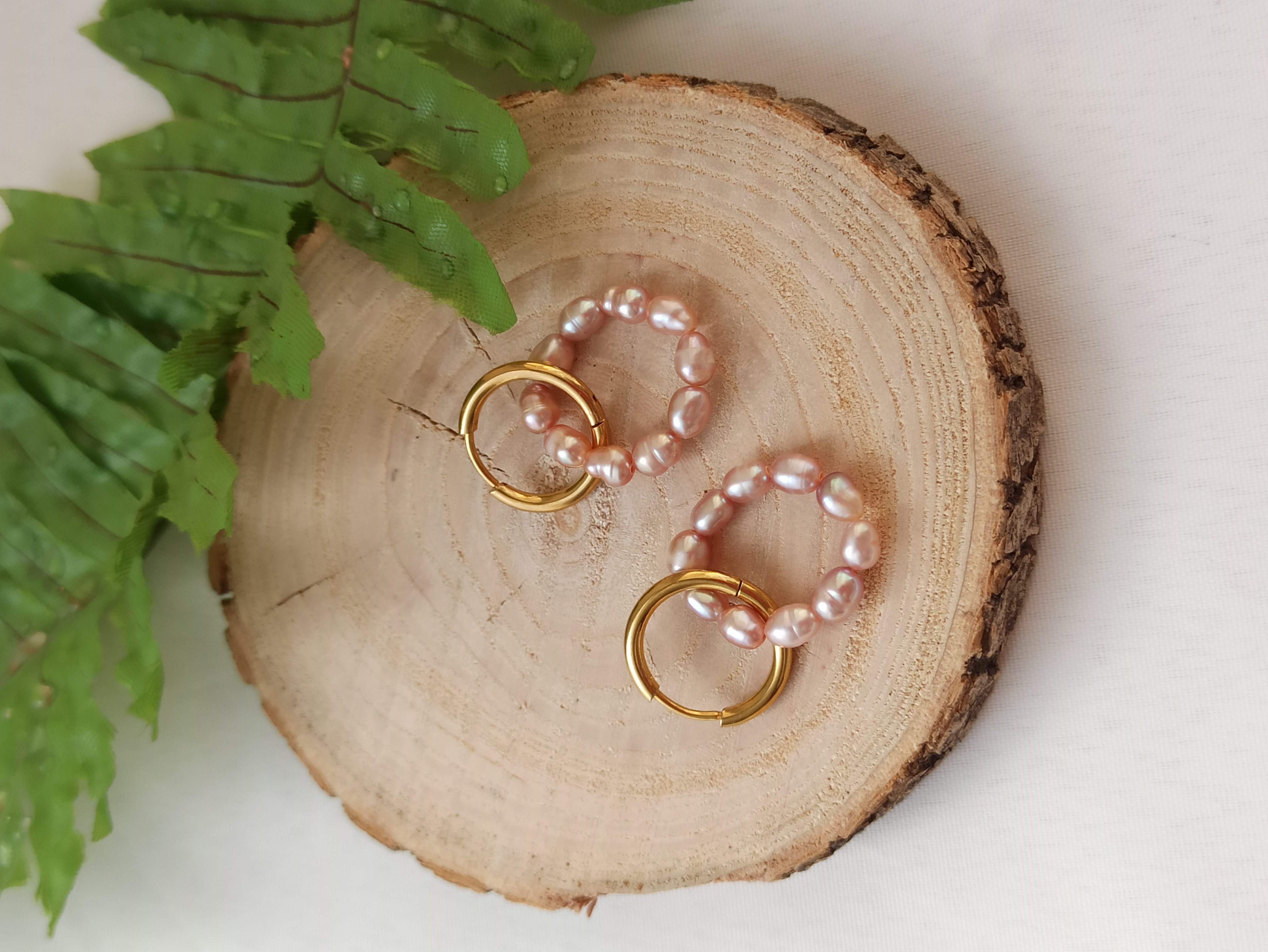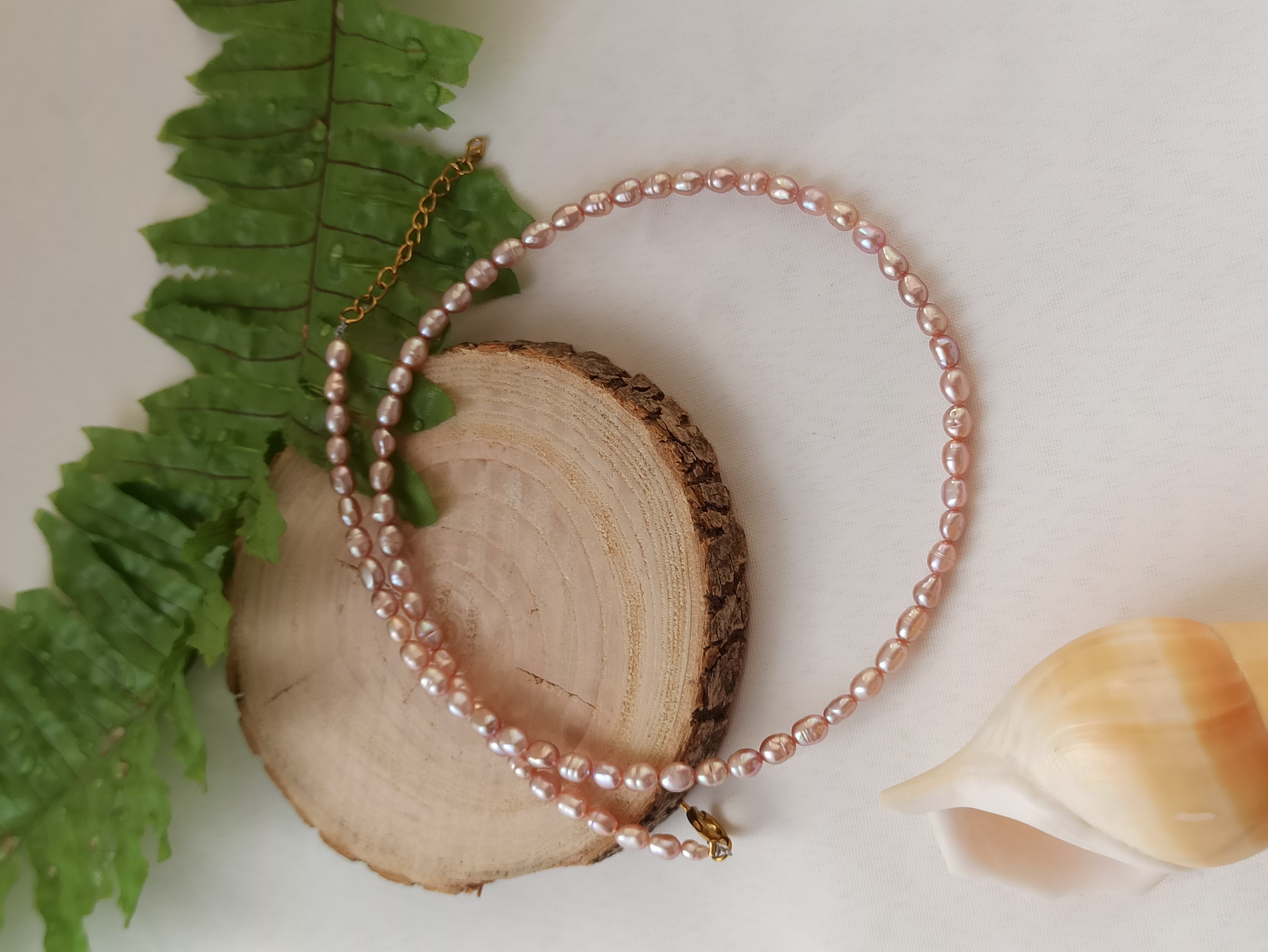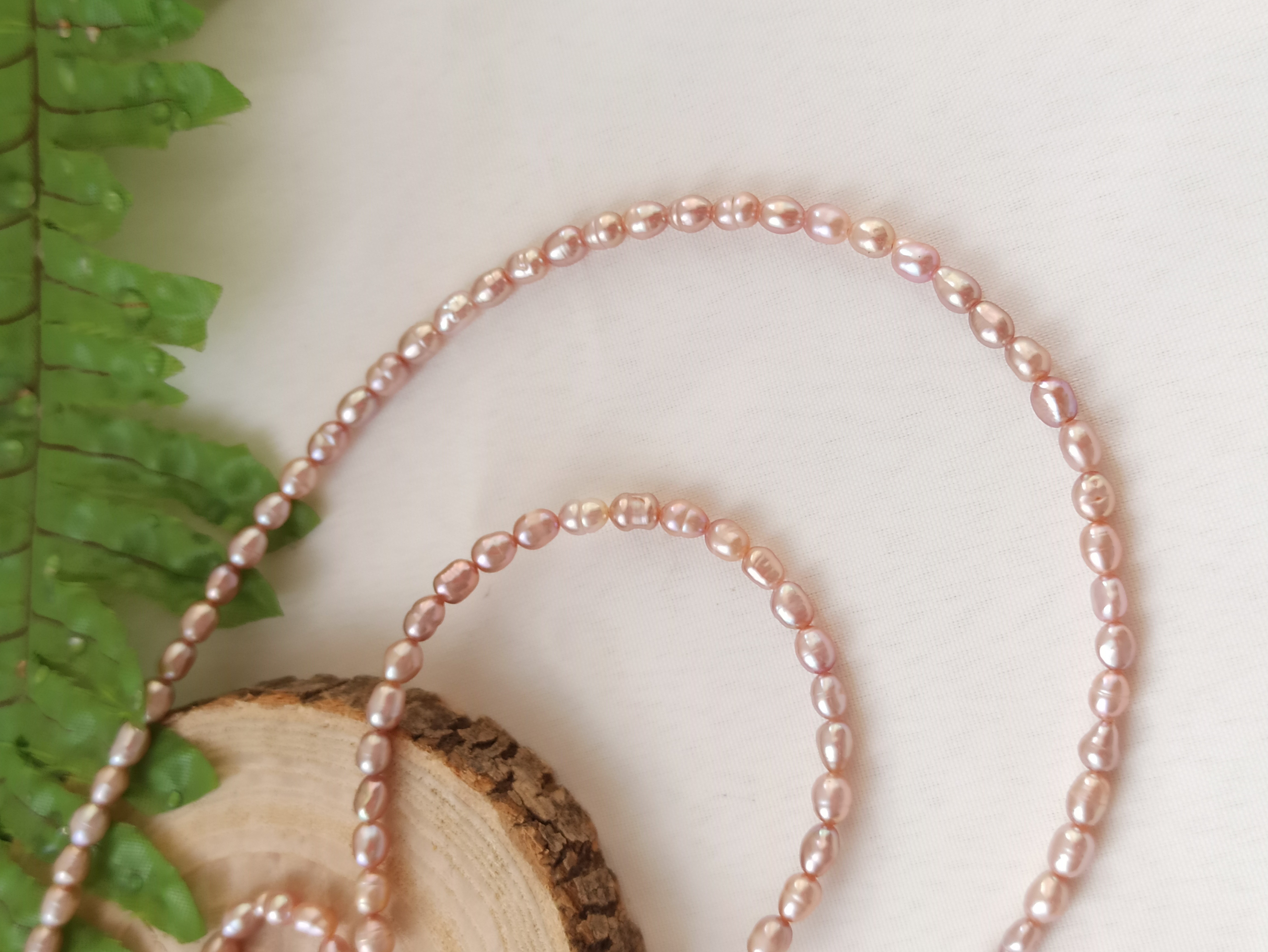سرویس کامل مروارید پرورشی گندمی، صورتی ملیح، سایز ۴ میلیمتر، متریال استیل طلایی، دستساز