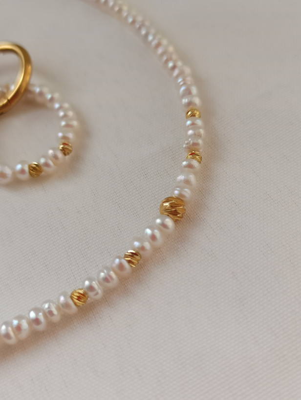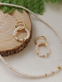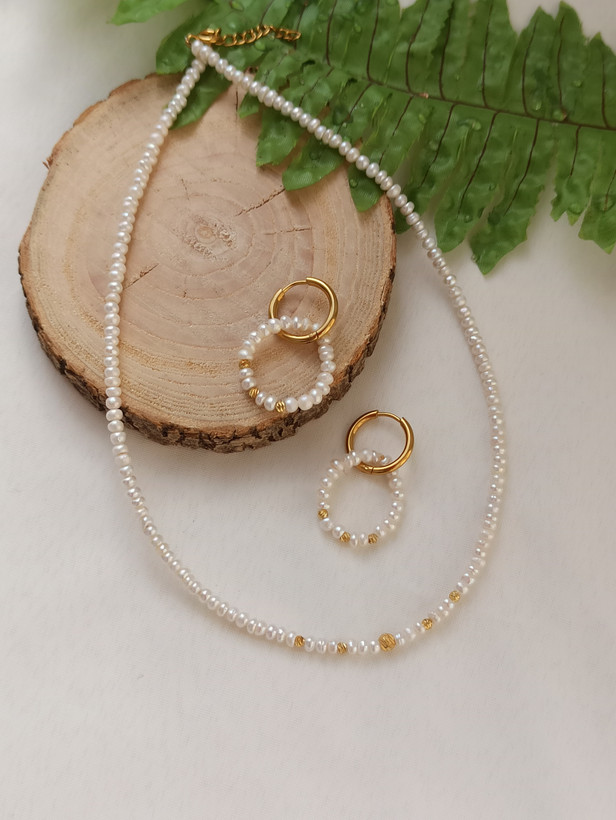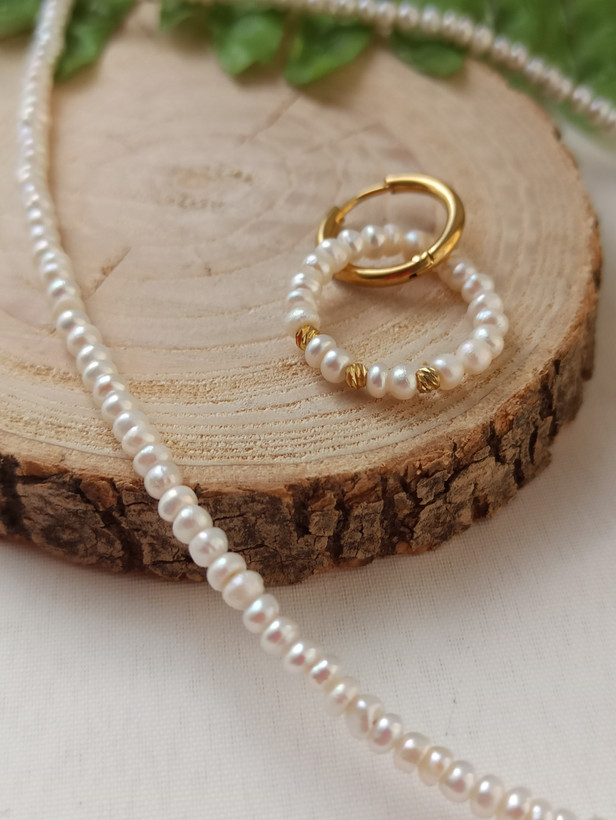 ست گردنبند و گوشواره مروارید پرورشی سایز ۲/۵ میلیمتر، کیفیت A+، گوی البرنادو طلایی، دستساز، متریال استیل، طول ۳۹ سانتی متر و زنجیر سایز.