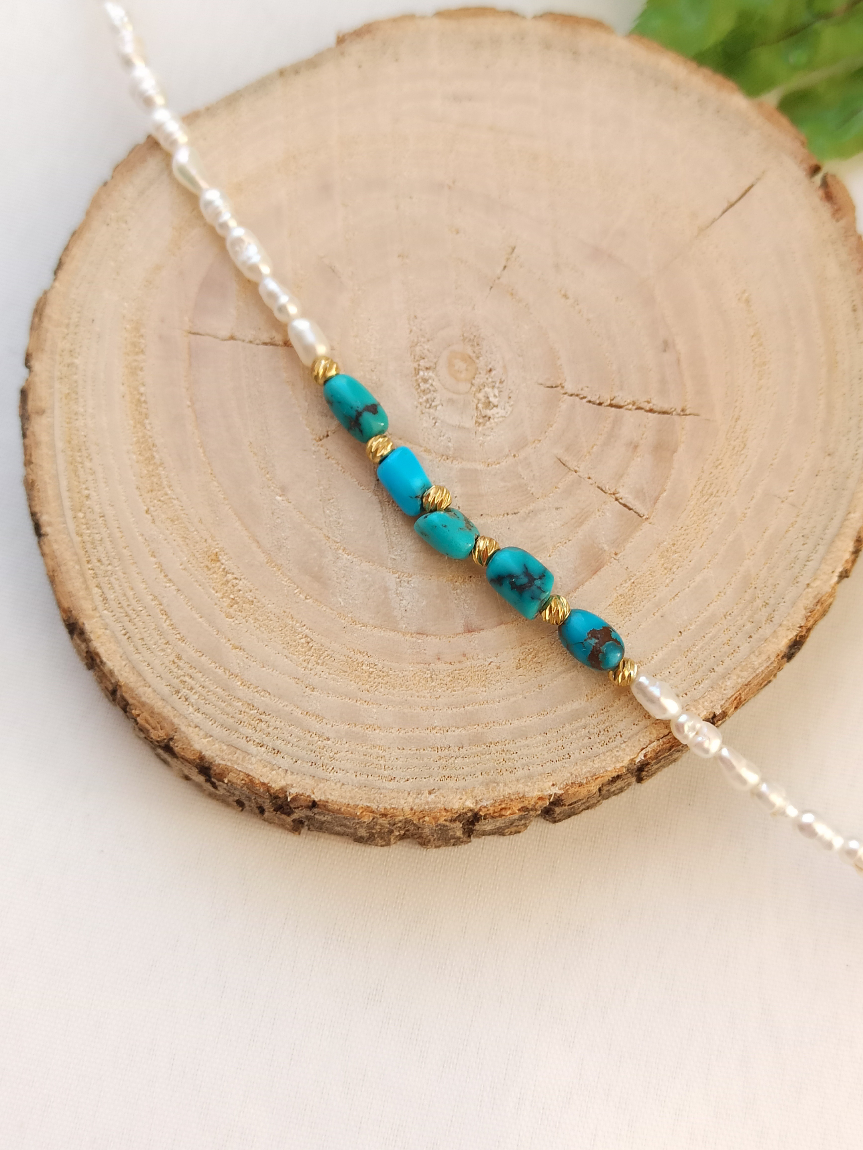 چوکر گردنی مروارید پرورشی و فیروزه نیشابوری، همراه با گوی البرنادو طلایی، دستساز و زیبا، طرح انحصاری گالری عالیا، متریال استیل، دارای زنجیر سایز