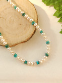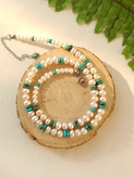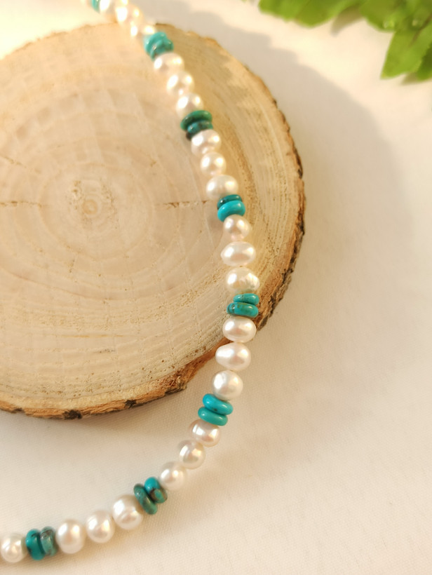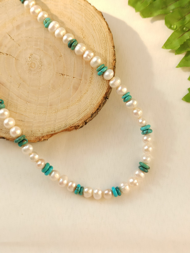 گردنبند لوکس ساخته شده با مروارید پرورشی کیفیت A+ و فیروزه نیشابوری تراش خزامه، قفل و متریال استیل با کیفیت، طول گردنبند ۴۶ سانتیمتر