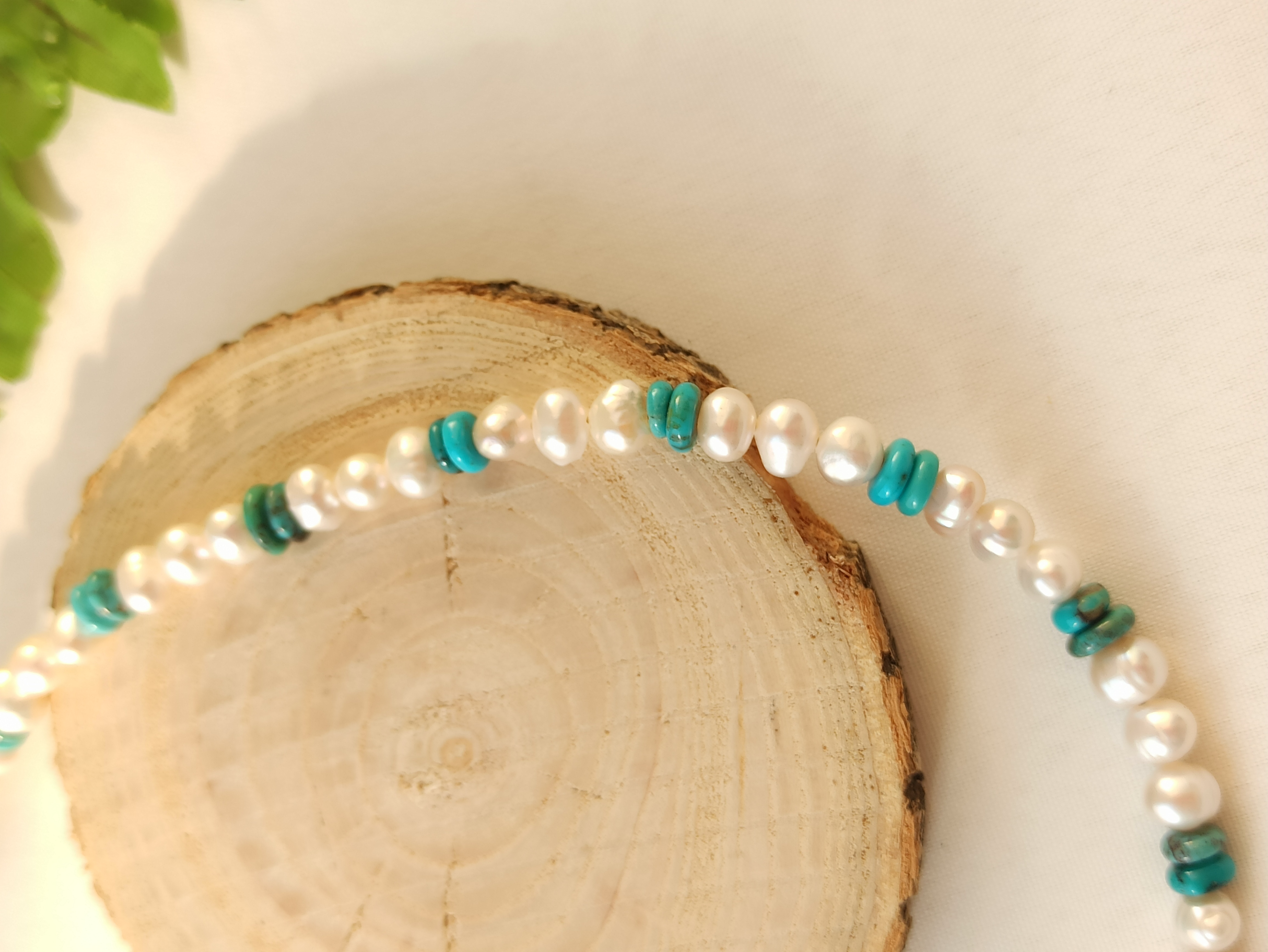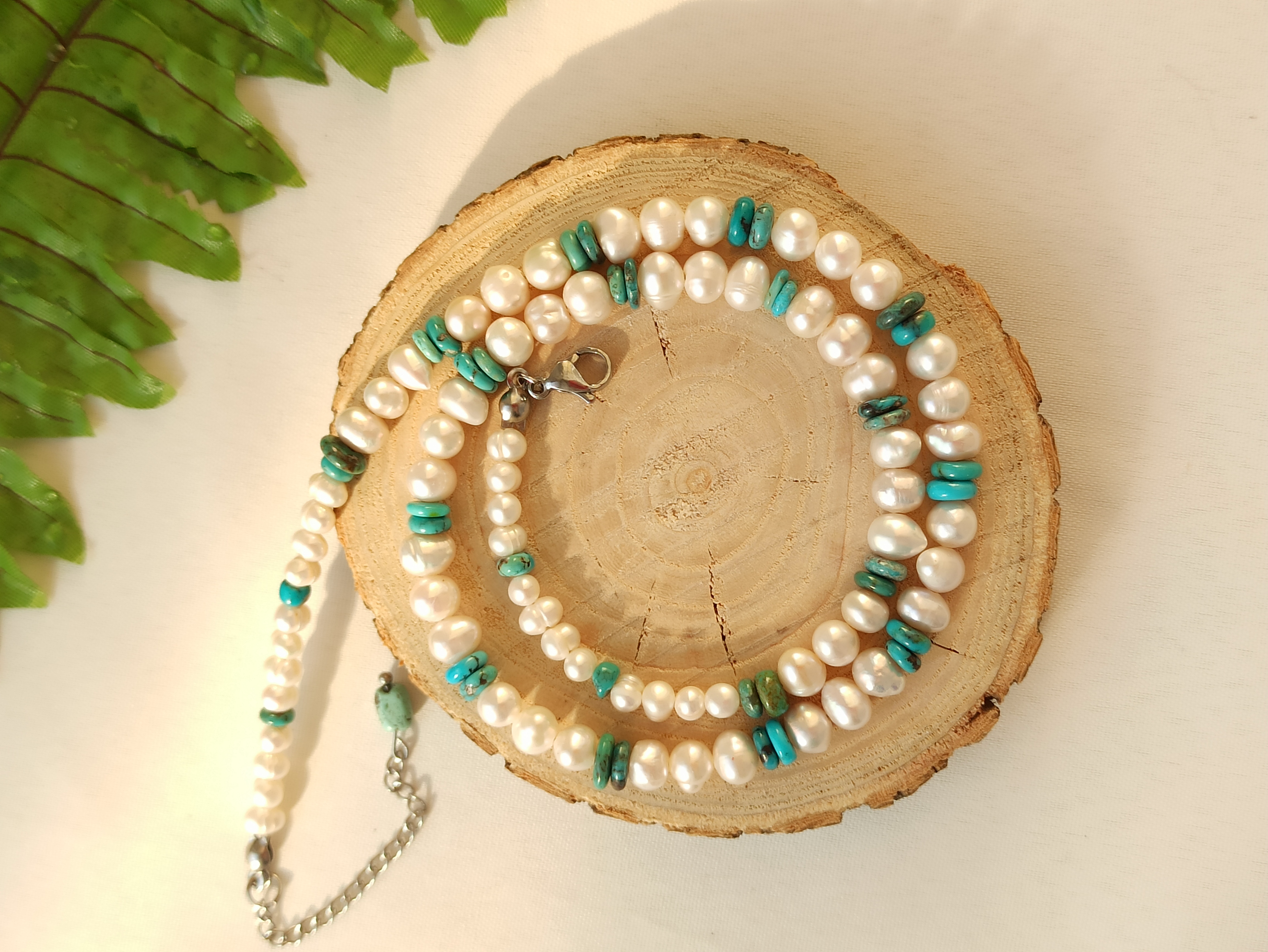 گردنبند لوکس ساخته شده با مروارید پرورشی کیفیت A+ و فیروزه نیشابوری تراش خزامه، قفل و متریال استیل با کیفیت، طول گردنبند ۴۶ سانتیمتر
