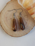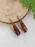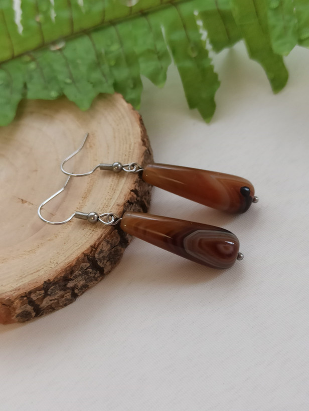 جفت گوشواره عقیق سلیمانی طبیعی، تراش اشکی به طول ۴ سانتی متر، ترکیب رنگ قهوهای سیر و متوسط، دارای نقوش طبیعی، متریال استیل، خاص و شکیل