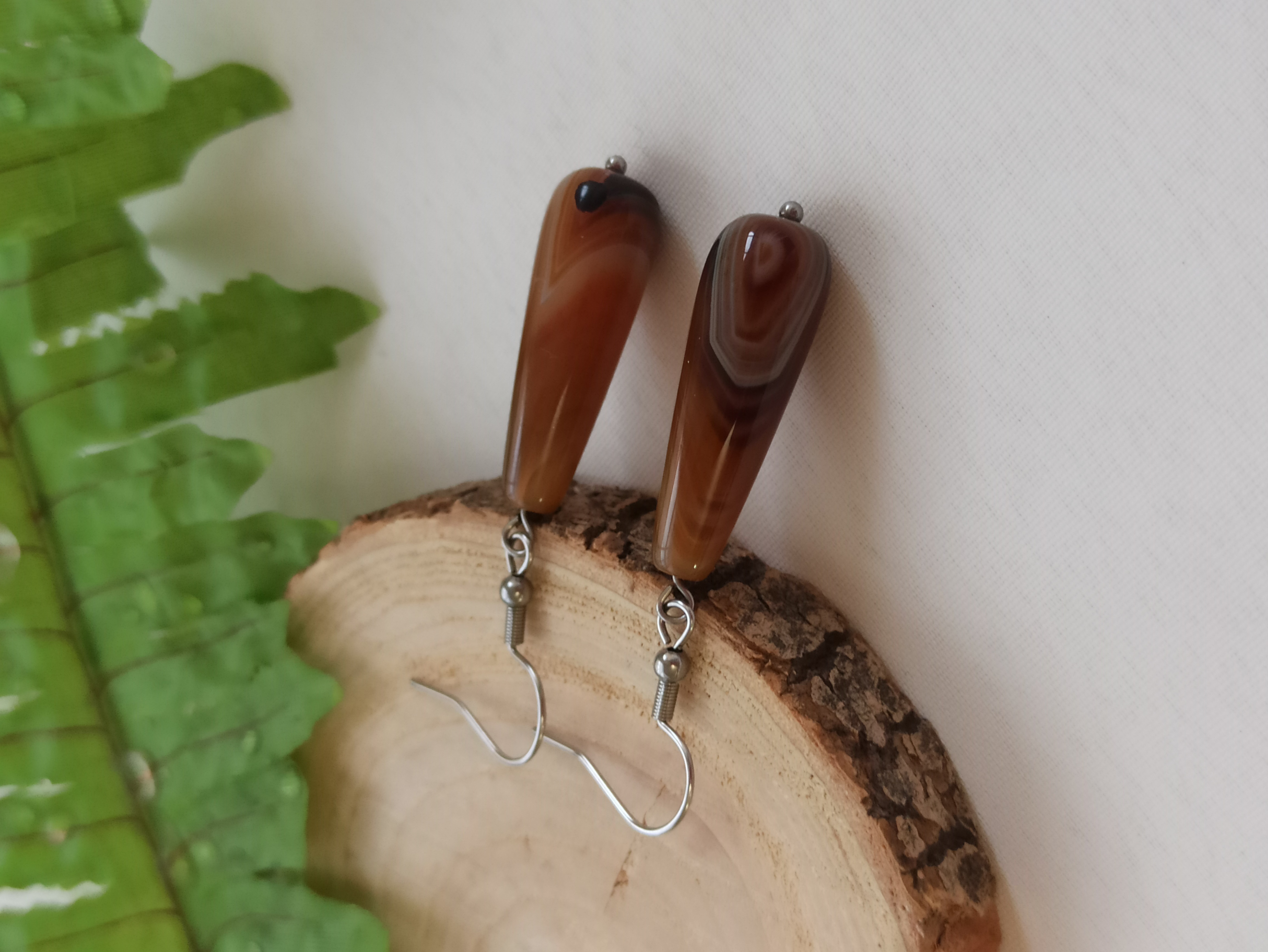 جفت گوشواره عقیق سلیمانی طبیعی، تراش اشکی به طول ۴ سانتی متر، ترکیب رنگ قهوهای سیر و متوسط، دارای نقوش طبیعی، متریال استیل، خاص و شکیل